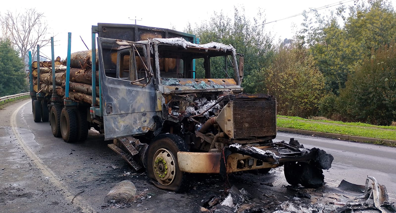 Un nuevo hecho de violencia que implicó la destrucción por fuego de un camión de transporte ha conmocionado a la industria maderera de la región de La Araucanía. Y es que, como averiguaron detectives de la Brigada de Investigaciones Policiales Especiales y Antisecuestro de la Policía De Investigaciones (PDI) alrededor de las 05:30 de la madrugada de hoy, en el kilómetro 12 de la Ruta S-40 en la comuna de Nueva Imperial, al menos tres sujetos aún no identificados y encapuchados, premunidos de escopetas, cerraron el paso a un camión que circulaba por dicho sector, cargado con madera destinada a la ciudad de Nacimiento.
