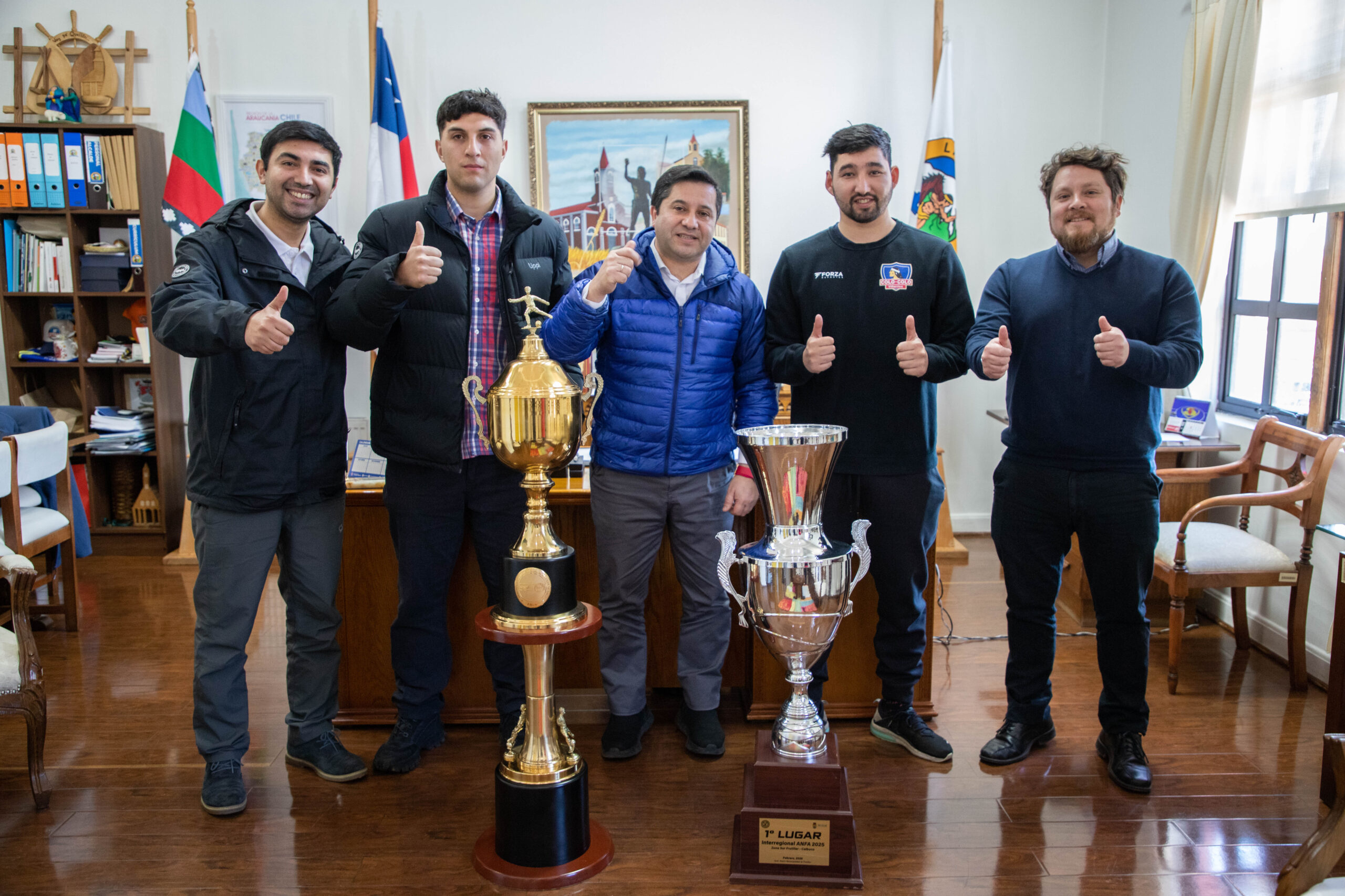 El alcalde de Lautaro, Ricardo Jaramillo junto al administrador municipal, Cristián Salinas y el encargado de deportes, Sergio Moraga, recibieron este jueves a dos jóvenes deportistas de la comuna que han destacado a nivel regional y nacional en el fútbol amateur, ellos son Héctor Alarcón y Sebastián Calabrano, ambos arqueros formados en el fútbol local.