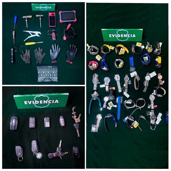 Agregó además “en la revisión del vehículo encontraron un importante número de especies, relojes de distintas marcas, joyas varias, controles y llaves de vehículos de diferentes marcas, herramientas como guantes, atornilladores, ganzúas y dos clonadores de llaves y un escáner automotriz. Se hace presente, que uno de los detenidos mantenía vigente una medida cautelar de arresto total por el delito de robo de vehículo motorizado”, señaló el Capitán Llanquimán.