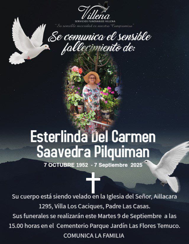 DEFUNCIONES DEFUNCIÓN: Esterlinda Del Carmen Saavedra Pilquiman 2 de Septiembre de 2025 FacebookTwitterPinterestWhatsApp