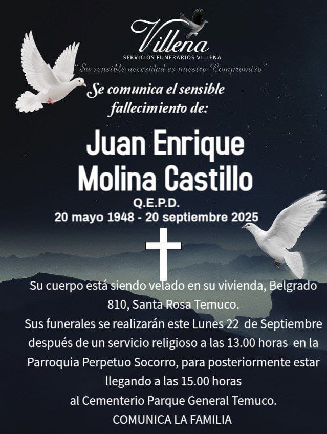 DEFUNCIONES DEFUNCIÓN: Juan Enrique Molina Castillo 20 de Septiembre de 2025 FacebookTwitterPinterestWhatsApp