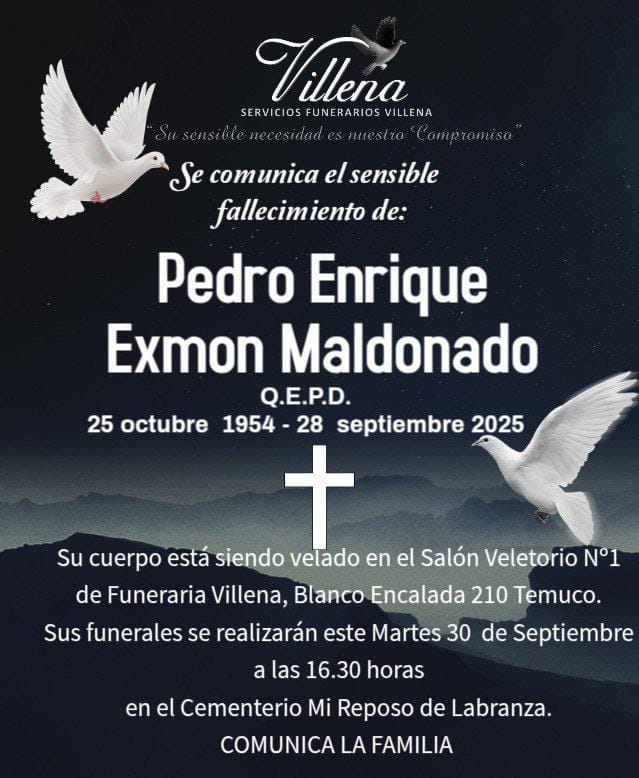 DEFUNCIONES DEFUNCIÓN: Pedro Enrique Exmon Maldonado 28 de Septiembre de 2025 FacebookTwitterPinterestWhatsApp