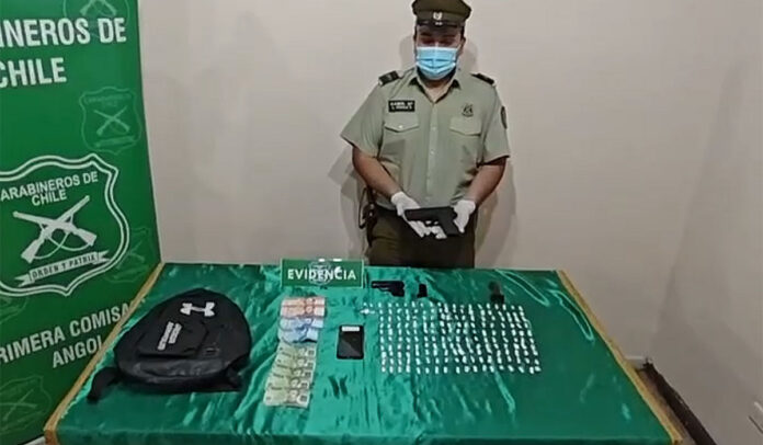 Tras la llegada de Carabineros, se efectuó una revisión de la mochila del menor, donde se encontraron dos pistolas, una de ellas a fogueo y la otra adaptada para el disparo, papelillos con droga y dinero en efectivo, elementos que fueron incautados como parte de la investigación.